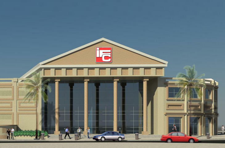 Showroom and office: glass curtain wall and marble cladding over precast concrete shell