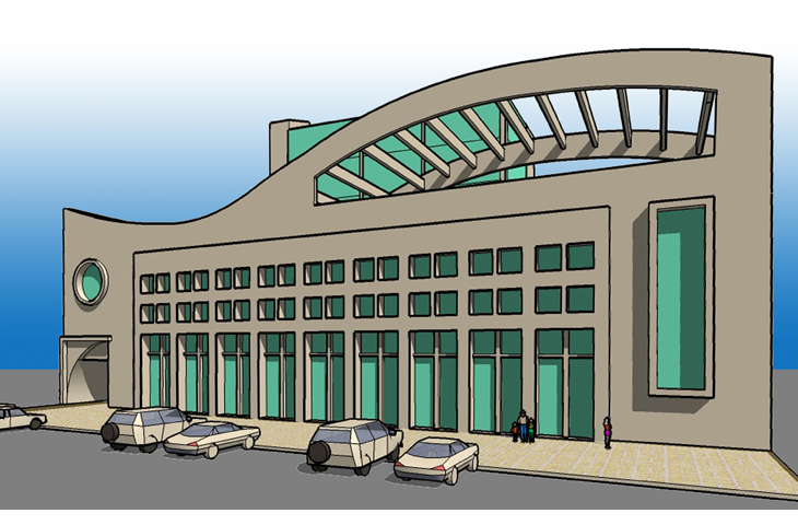 Glass curtain wall & Italian marble cladding over CMU shell
